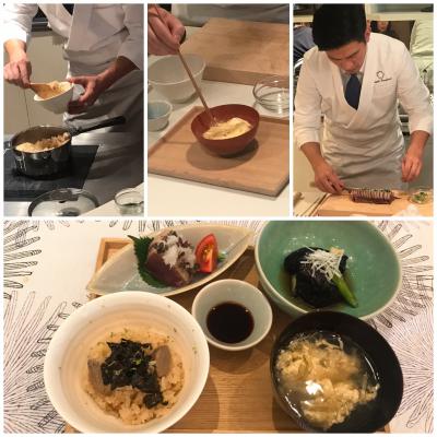 今回の料理教室では、白飯の他に「小芋の炊き込みご飯」「茗荷のむらくも汁」「戻り鰹のみぞれたたき」「秋なすの煮物」と秋の食材をふんだんに取り入れたレシピも紹介。食材の切り方からきれいな盛り付け方まで、日本料理・茶懐石のプロが間近で実演しながら丁寧に教えてくれるというまたとない機会に、参加者した方の多くはキッチンカウンターから身を乗り出してメモをとってらっしゃいました。