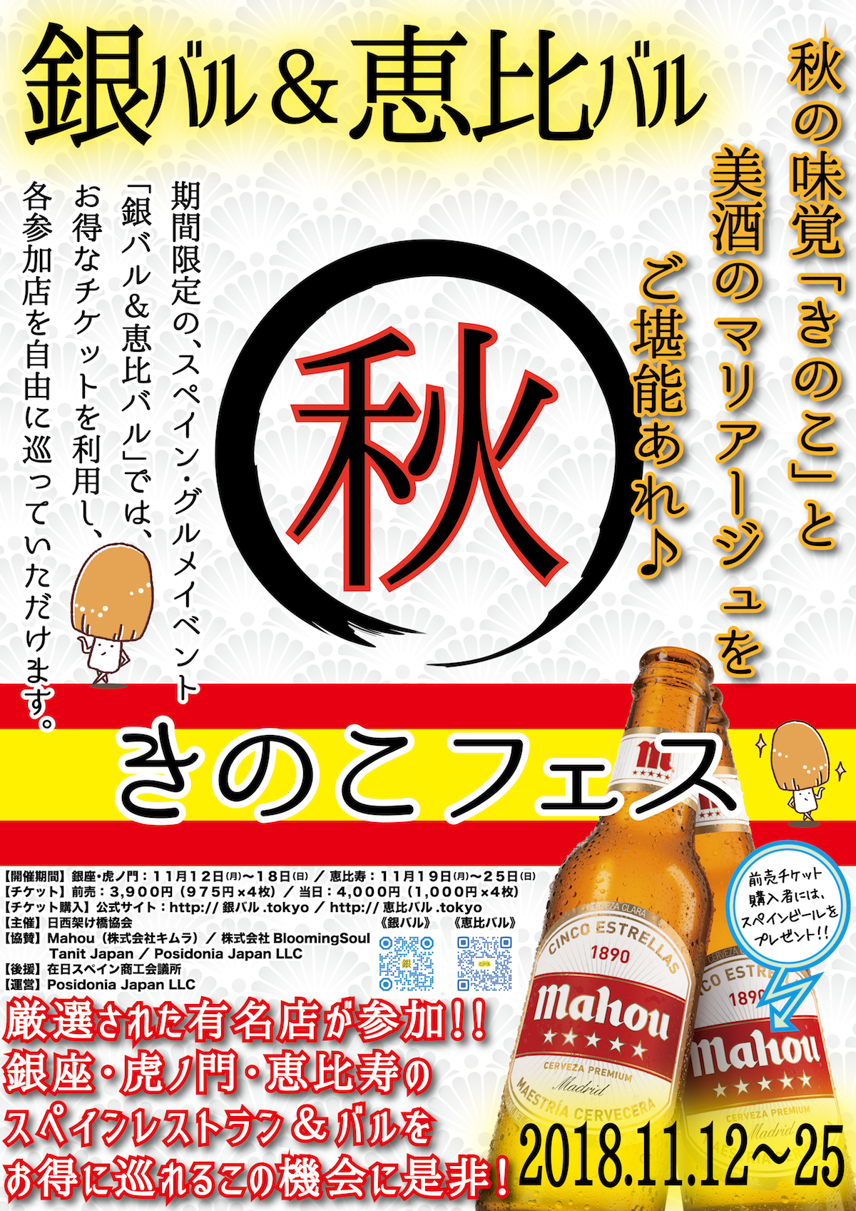 『銀バル』Vol.4のテーマは、”秋・きのこフェス” です!『銀バル』の各参加店では、参加者の皆様に、秋の味覚「きのこ」とスペインビールのマリアージュで、秋の夜長を楽しんでいただけるよう、スペイングルメの代表格である、”きのこのアヒージョ” など、『銀バル』ならではの、「きのこのタパス」をご用意し、お待ちいたしております!(※詳細は、近日公開予定。)