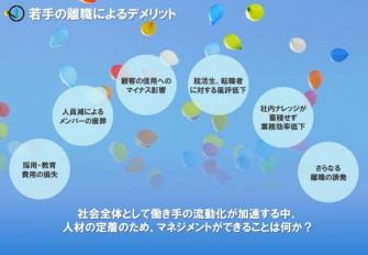 本プログラムでは、現場の管理職の方を対象とし、離職のボリュームゾーンである「若手・中堅社員」の離職防止について様々な角度から考えます。実際の事例に基づいたケーススタディや映像教材、体感ワークなどを通じて、管理職として離職防止に取り組む必要性を理解し、メンバーの一人ひとりに対し、明日から意識して対応するべきアクションの具体化をご支援致します。