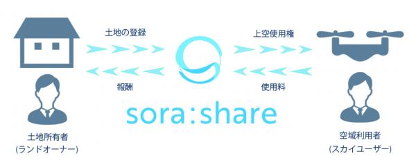 土地所有者はsora:share上で土地の情報を登録、空域利用者は登録された土地を選び、飛行する権利を得ることができる。その対価として、利用者は使用料を支払うという仕組みだ。