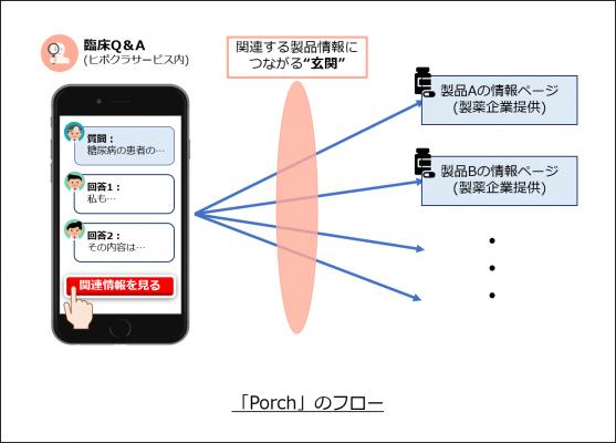 エクスメディオの提供する「ヒポクラ × マイナビ」は、人工知能(AI)を活用して臨床課題の解決を図る臨床支援サービスで、現在約3万人の医師に利用されております。医師同士が互いの知見を持ち寄り、時に質問する側になり、時に回答する側となることで運営されるこのサービスは、日本で最も臨床に関するQ&Aが集まっている場所ということができます。このシステムを製薬企業に新規のオンラインチャンネルとして活用してもらうことが、今回の新しい仕組み「Porch」です。