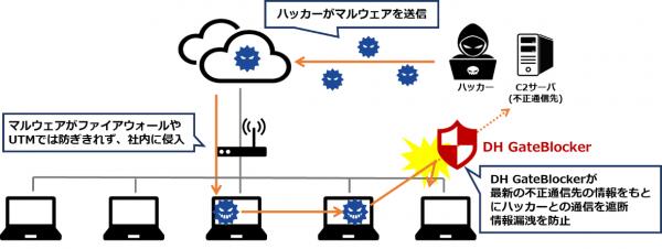 「DH GateBlocker」は、セキュリティの「入口対策」では完全に防御することが難しい標的型攻撃などによって感染した社内IT資産からの社外への不正通信を検知・遮断する「出口対策」ソリューションであり、DDSと協業しているセキュリティ監視事業大手の株式会社ラックが保有する不正通信先の情報を取り入れることで、不正通信を高確率で検知できることを最大の特徴としております。また、ご利用者アカウント数やセンサー台数などに応じたサービスプライスにより、事業規模の大小にかかわらず、リーズナブルなコストで、社内から社外への不正通信を検知・遮断し、情報漏洩の被害を最小限に抑えることが可能です。