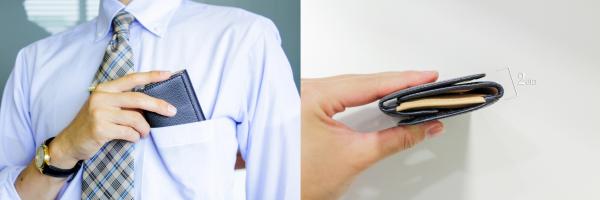 スマートウォレットの特徴はなんといってもそのコンパクトさにあります。中身を抜いて畳んだ状態で縦7×横9.2×厚2cm、重さ57gと非常に軽量で、上着やシャツなどのポケットにもすんなり入り軽装の時にも邪魔になることなく持ち運びができます。