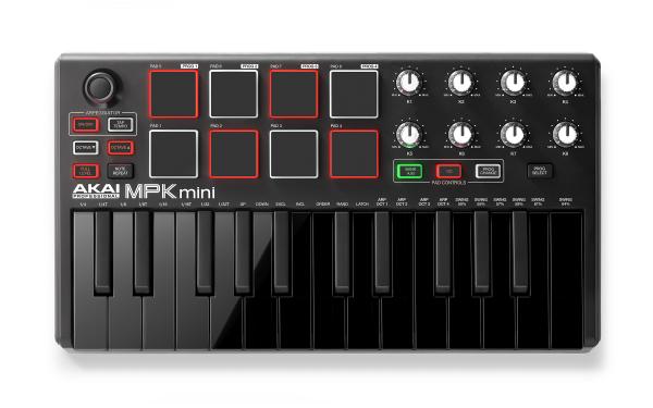 Akai Professionalの数量限定ブラック色のMPK Mini MKll LEは、移動が多いミュージシャンやコンパクトな環境で音楽制作をする方向けに設計された、黒を基調としたボディーと鍵盤が印象的な小型MIDIキーボード/パッドコントローラーです。