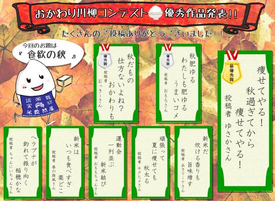 米穀の製造加工および販売を手掛ける株式会社むらせ(本社:神奈川県横須賀市米が浜通1-6、村瀬 慶太郎 社長)が運営する“むらせライスサポーターサイト” において、9月1日(土)から9月30日(日)まで開催した、「おかわり川柳コンテスト」の結果を10月12日(金)に発表いたしました。