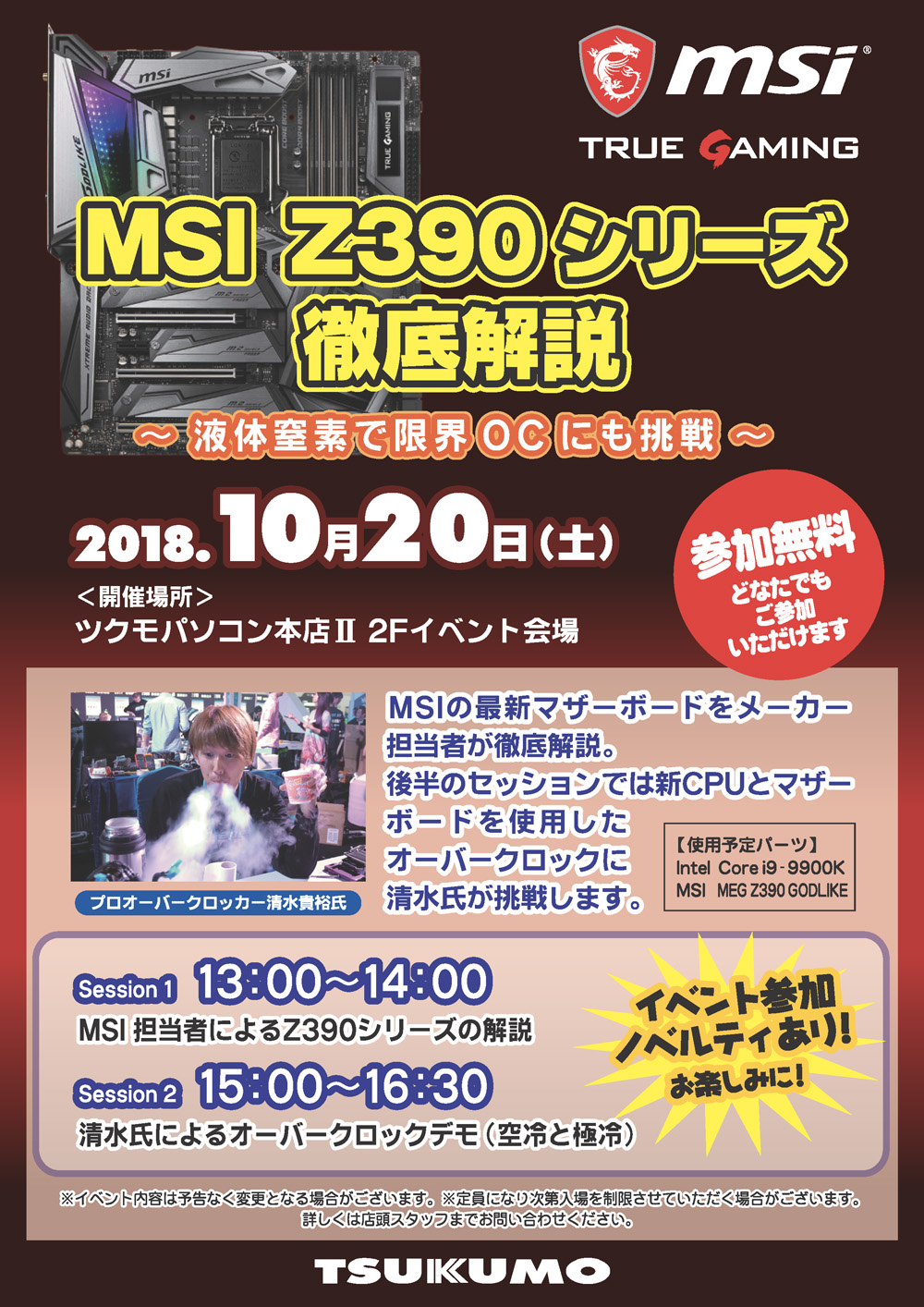 本イベントは下記の2部構成で、10月9日に販売を開始したIntel Z390チップセットを搭載したMSIマザーボード新製品のご紹介と、オーバークロッカー清水貴裕氏が、Coffee Lake RefreshことIntel Core i9 9900Kを使って、MEG Z390 GODLIKEで空冷と液体窒素を使った極冷環境でオーバークロックの限界に挑戦します。CPUダイとヒートスプレッダーの熱伝導にソルダリングを採用することで、より高クロック動作を実現したCoffee Lake Refreshの限界への挑戦にご期待ください。