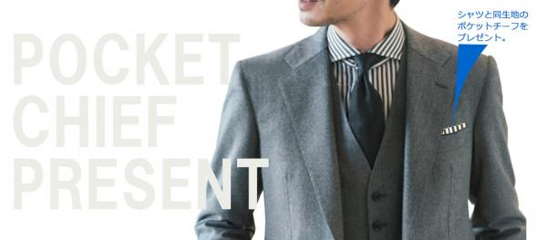 通常は、カスタマイズのページでシャツと同時購入となるポケットチーフのトライアルフェアを2018年10月18日より10月21日まで開催。オーダーシャツをフェア期間に購入した全員に無料でプレゼント。
