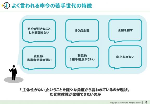 これからの働き方に関して企業へ人材育成・組織開発サービスを展開する株式会社NEWONE(本社:東京都千代田区 代表取締役:上林周平)(https://new-one.co.jp/)は、イマドキ若手社員の育成方法として、当事者意識とエンゲージメントアップを狙ったブーメラン手法を用いた研修プログラムを新たに開発、2018年10月1日より販売開始致しました。