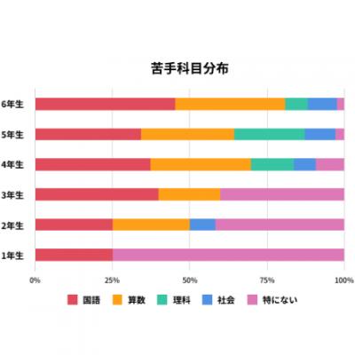 お子さんの苦手科目について学年別にたずねて見ました。どの学年も共通して、国語が苦手なお子さんが比較的多いようです。