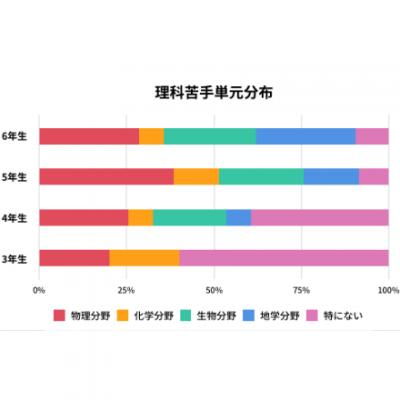 理科の苦手単元について、3年生は半数以上のお子さんが苦手意識を持っていいないようですが、4年生以降になると苦手意識を持つお子さんが多くなっています。全体的に「物理分野」が苦手だというお子さんが特に多く、6年生になると「物理分野」、「生物分野」、「地学分野」に分散される結果となりました。