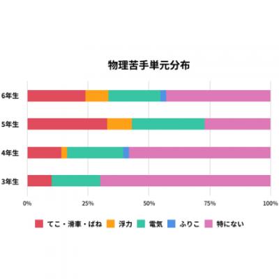 全体的に苦手意識を持つお子さんの多かった物理分野については、「てこ・滑車・ばね」、「電気」の単元が苦手だというお子さんが多い結果になりました。
