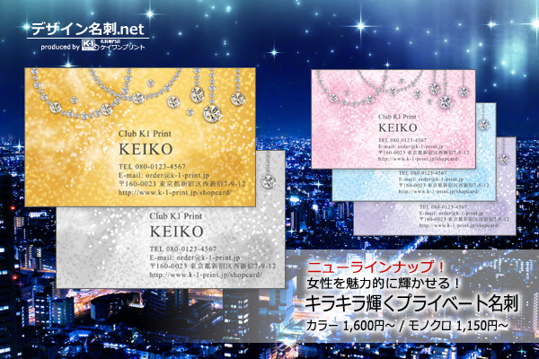 株式会社ケイワンプリント(本社:東京都新宿区、社長:丸山正紘、資本金:1,000万円)は、女性を魅力的に輝かせる、リッチでシャイニーなプライベート名刺を、2018年10月18日から販売いたします。服飾やアクセサリーショップ、ガールズバーなど、女性の魅力を引き出すご職業でも利用しやすいデザインです。