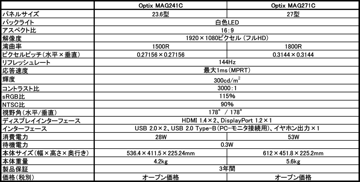 23.6型モデルのOptix MAG241Cはパネルサイズにあわせて曲率1500R(半径1500mmのカーブ)と、従来の1800R(半径1800mm)に比べて曲率を高めることで、より没入感のあるゲームプレイを可能にしています。また、27型モデルのOptix MAG271Cについては、従来どおり1800R(半径1800mm)を踏襲しています。両製品とも1980×1080ピクセルのフルHD表示に対応したVAパネルを採用することで、144Hzの高リフレッシュレート表示と、最大1msの応答速度を実現。ディスプレイ入力にはHDMI×2、DisplayPort×1の3系統をサポートし、視野角は178°のワイドビューアングルに対応。薄型ベゼルの採用により、マルチディスプレイ環境において、よりシームレスな視野を得ることが可能です。また、液晶スタンドは高さや角度の調整範囲を増やしているほか、VESAマウントにも対応し、市販のアームとの組み合わせによって、より柔軟な設置ができます。さらに、両製品とも、本体横にヘッドセットフックを備えており、普段のゲームプレイ時に素早くヘッドセット装着することができます。