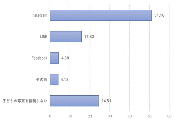 「子どもの写真を投稿しない」の24.51%を除けば、「Instagram」が51.16%と最も多く、次いで「LINE」が15.83%と続きました。写真の投稿といえばInstagramと言えるほどに、その利用率が他のSNSに比べて圧倒的に高いことが分かります。