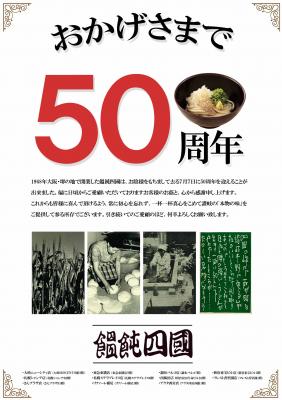株式会社 壁の穴(本社:東京都渋谷区恵比寿3-28-12、代表取締役社長:河原庸仁)が運営する「饂飩四國」は、去る7月7日に50回目の開業日を迎えたことを記念し、「50周年四國大感謝祭」と銘打ち、11月1日~18日の18日間に渡り、目玉商品の特別価格での販売などの各種感謝イベントを実施いたします。