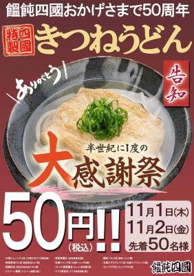 饂飩四國、11月1日・2日に特製きつねうどんを先着50名様に50円にてご提供する「50周年四國大感謝祭」を実施。
