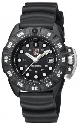 すべての海洋における調査任務を果たすダイバーに向けて必要不可欠な道具として作られた時計で、ケースは今年ルミノックスとして商標登録もおこなった独自の軽量ケース【CARBONOXTM】。カーボン主体のCARBONOXTMケースは、スティールの6倍軽く、非アレルギー性で、非常に頑丈。加えて表面のグレイカラーの質感が特徴となっています。
