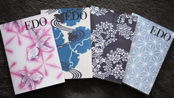今年で発売から9年目となる「江戸帖」は、「江戸の美意識と暮らす粋な毎日」がコンセプト。カバーには天保13年創業の染呉服の老舗「竺仙」の浴衣の柄を使用し、お客さまの人気投票で決定した「雪輪に波千鳥」「変わり麻の葉」「花の丸」「金魚(オンラインショップ限定)」の計4柄を販売いたします。