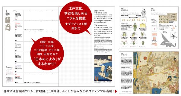 内容は、旧暦・月齢・六曜・十干十二支・二十四節気・七十二候など、日本のこよみを網羅し、江戸の祭や行事も掲載。季節に合わせた江戸コラム、有識者コラムなど江戸の知識が満載で、ページを開くたびに日本・東京が身近になっていきます。浮世絵もふんだんに配し、全編ダイジェスト英訳付きなので海外へのお土産にも好評です。