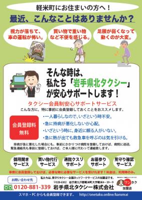 この度、岩手県北タクシー(本社:岩手県軽米町)は、(株)デカルト(本社:岩手県盛岡市)が運営するワンタク・見守りタクシー全国ネットワークサービスに加盟し、協働で御用聞きサービスや見守り確認サービスをはじめとした会員制の見守りタクシーサービスを10月25日(木)から軽米町内で開始いたします。