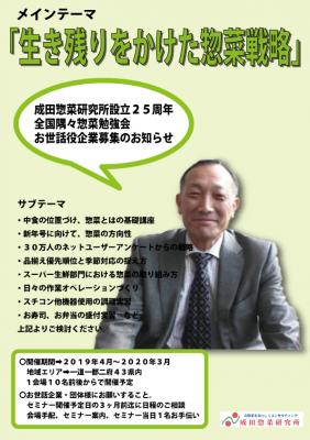 成田惣菜研究所(有限会社ナリタヤ 代表取締役:成田廣文)では、研究所設立25周年を記念し2019年4月より2020年3月まで「全国隅々惣菜勉強会」を開催致します。