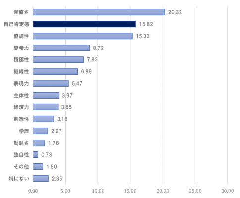今回、調査結果の中で最も興味深いと感じたのは「素養」に関する結果である。本調査では「親から言われた重要な素養」、「実際に役立った素養」、「子どもの将来に重要だと考える素養」をそれぞれ質問した。3つの結果を並べたものが図2~図4である。その結果、素直さ・協調性・積極性に関してはどの項目においても上位であったが、おもしろいのが「自己肯定感」に関する結果である。「自己肯定感」は「親から言われた重要な素養」では2.55%ほど、「実際に役立った素養」では4.30%なのに対し「子どもの将来に重要だと考える素養」では素直さに次いで2番目に多く15.82%である。つまり「自己肯定感」を重要だと考える「いま」のママパパが多いということである。