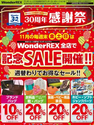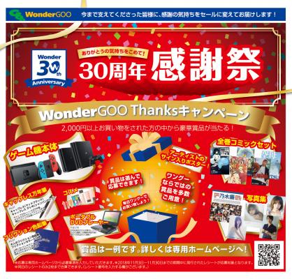 株式会社ワンダーコーポレーション(本社:茨城県つくば市 代表取締役会長兼社長:内藤 雅義)は、お客様にご愛顧いただき、今年で創業30周年を迎えることができました。お客様への感謝の気持ちを込めて、11月1日(木)から11月30日(木)までの1ヶ月間、WonderGOO・WonderREX・新星堂の全店舗で「30周年記念感謝祭」を開催いたします。