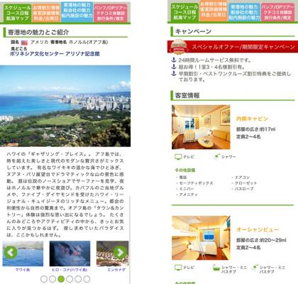 今回第1弾として、各コース詳細ページについて、寄港地、船内施設、部屋情報の文字サイズを大きくし、レイアウトを変更するなどのリニューアルを行いました。