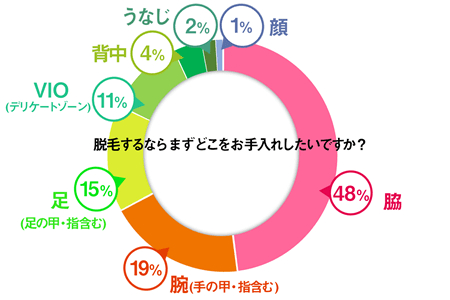 「脱毛するならまずどこをお手入れしたいですか?」という質問では、「脇」と答えた人が48%と半数近くにのぼりました。