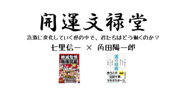 「~あの著者と語る、『開運文禄堂』~」は、角田陽一郎氏が、毎回、ヒット本の著者をお呼びして、“人生と本の醍醐味”をお聞きするトークイベントです。 初開催の第1回のゲストは これからの時代になくなってしまうかもしれない職種について書かれたショッキングな書籍『絶滅危惧職種図鑑/あさ出版』の著者の七里信一氏。時代が激しく動くなか、七里氏、角田氏が両著作の話を交えながら、これからの働き方、生き方についてトークします。