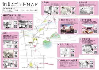 表紙は、このマップのためのオリジナル描き下ろしイラストを使用しています。マップ内に記載のQRコードを読み取ると地図アプリが起動し、登場スポットまで案内いたします。