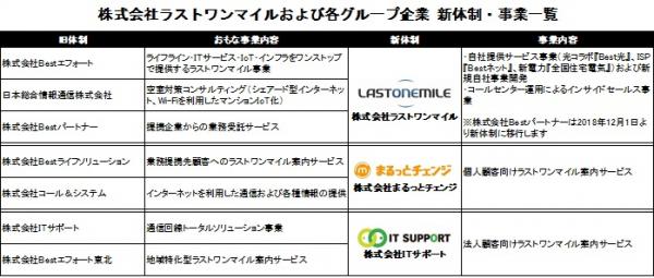 株式会社Bestエフォート(本社:東京都豊島区、代表取締役社長:清水 望、以下当社)は、2018年11月1日より社名を株式会社ラストワンマイルに変更します。これに伴い、当社グループ企業である株式会社Bestエフォート東北、株式会社Bestパートナー、株式会社Bestライフソリューション、株式会社ITサポートと、2018年に子会社化した株式会社コール&システム、日本総合情報通信株式会社の全7社も社名変更・組織統合を行います。