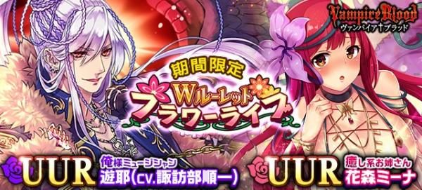 「諏訪部順一」さん演じる”甘いボイスの俺様ミュージシャン”「遊耶」と”花屋の癒し系お姉さん”「花森 ミーナ」は、期間限定で開催される「フラワーライブルーレット」に新登場します。ぜひこの機会に新カードを手に入れてください!『ヴァンパイア†ブラッド』では今後も続々とボイス付きカードの追加を予定していますので、どうぞご期待ください。