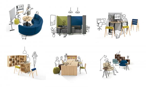 「ワークフラン」でラインアップする従来のアイテムと組み合わせて、ミーティングや集中作業などをスムーズに行えるさまざまなレイアウトを作ることができます。