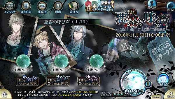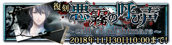 株式会社エレメンツリー(代表取締役:小川 邦弘、所在地:大阪市淀川区)は、2018年11月2日にホラーBLゲーム『チギリバコ』(CV.四ツ谷サイダー、鳩マン軍曹etc)11月イベント「[復刻] 悪霧の呼び声」の提供を開始しました。