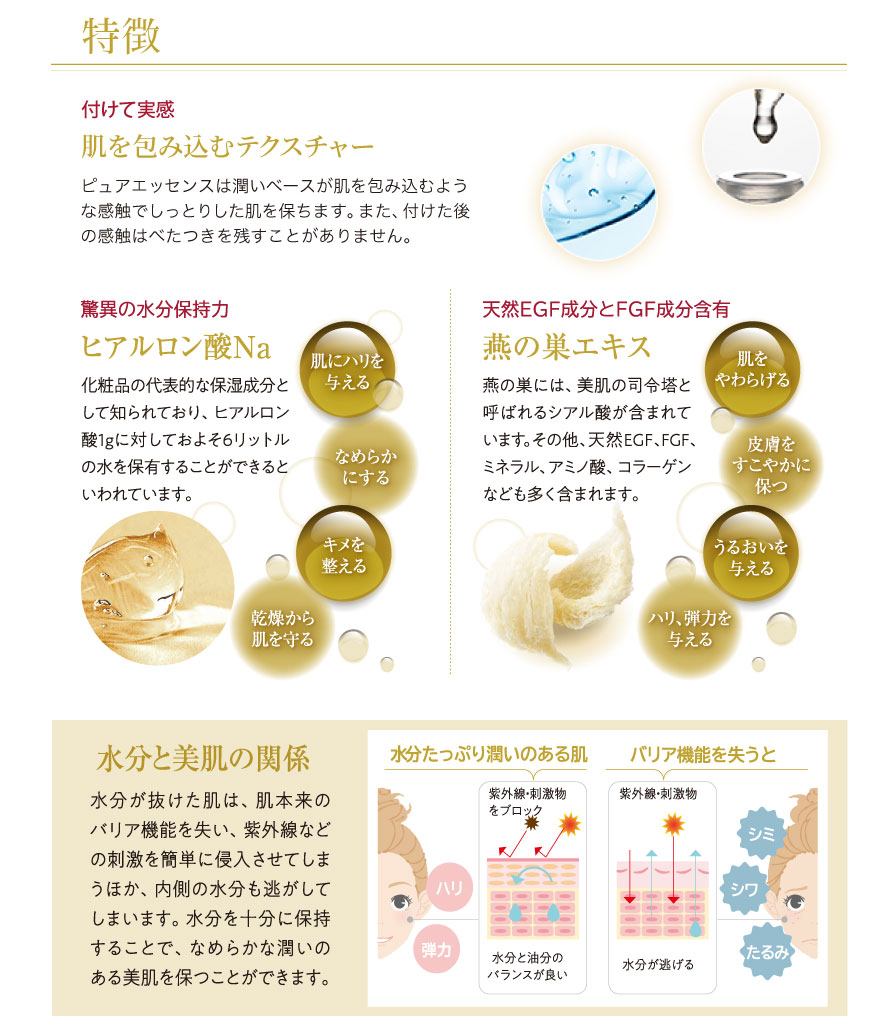 化粧ノリに欠かせない肌の土台作りとして、乾燥は大敵。なにより、乾きがちな肌はすべての肌トラブルの原因にもなりかねません。しかしながら、空気汚染や紫外線などの外的要因や、食事バランス、睡眠、ホルモンバランスの変化など、肌をとりまく環境は過酷です。そこで現代女性にとって真に必要な化粧品について原点に立ち返り、6種類の成分のみに厳選した夜用美容液「ピュアエッセンス」が誕生しました。夜のお手入れとして、化粧水の前になじませれば肌を柔軟にほぐす導入液として、化粧水の後に使えば深い潤いに肌が導かれる美容液としてご使用いただけます。