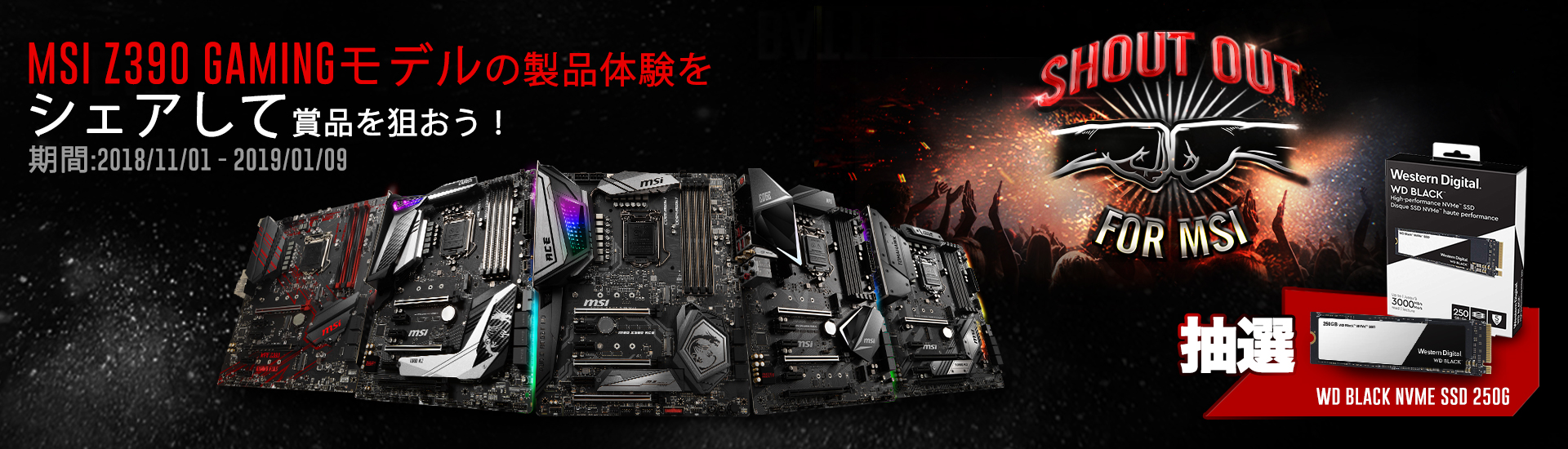 また、2018年11月1日~2019年1月9日の期間中に、Intel Z390マザーボードのレビューを投稿していただいた方については、Western Digital社製NVMe M.2 SSDの「WD Black PCIe SSD」 256GBモデルが抽選で合計80名様(各回20名様)に当たる「特別賞」をご用意いたしました。特別賞のレビュー投稿対象マザーボードは下記のモデルです。