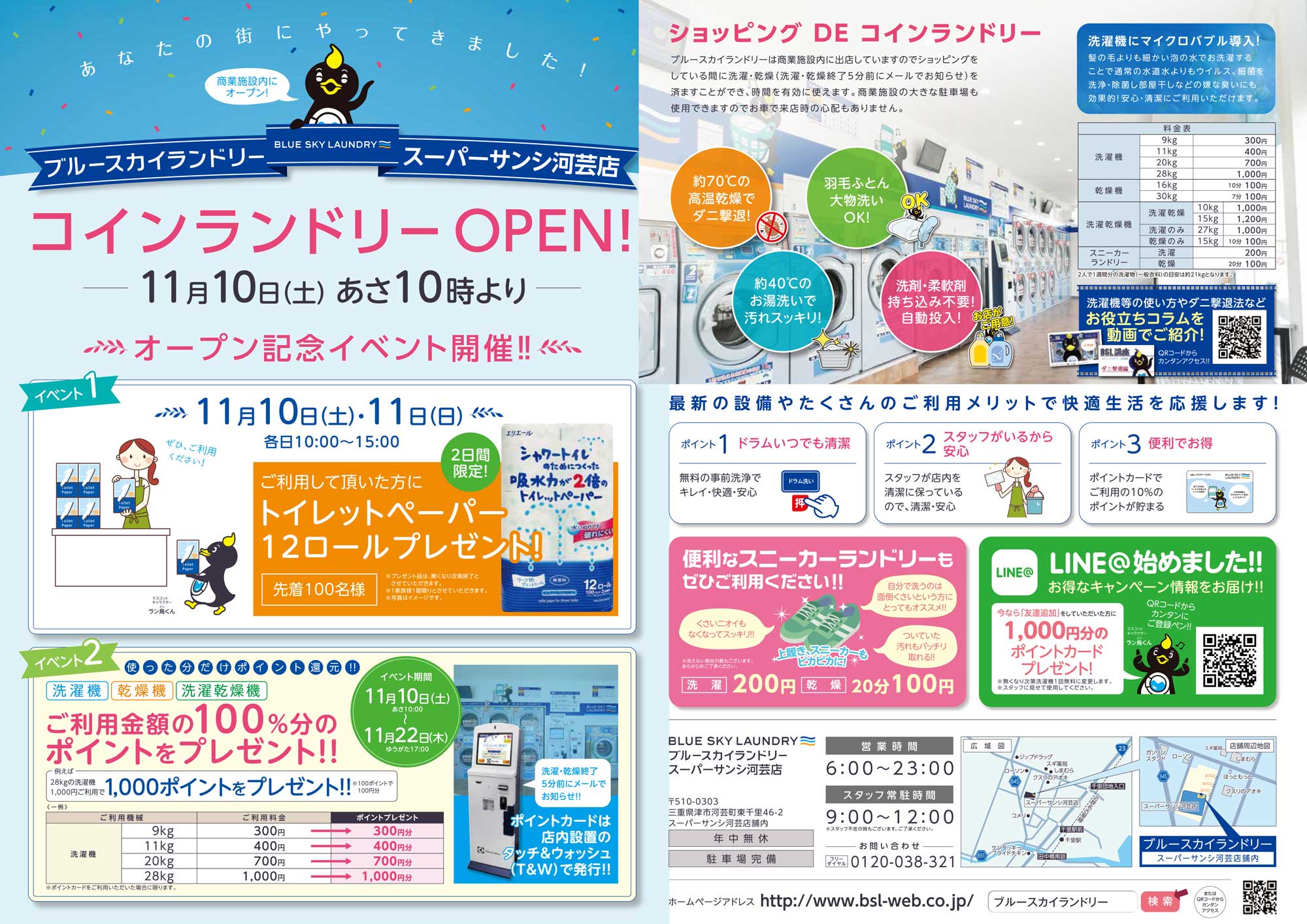私たちブルースカイランドリーは、大手商業施設敷地内にコインランドリーを集中出店しております。この度2018年11月10日(土)より、三重県津市にスーパーサンシ河芸店内にブルースカイランドリースーパーサンシ河芸店をオープン致します。