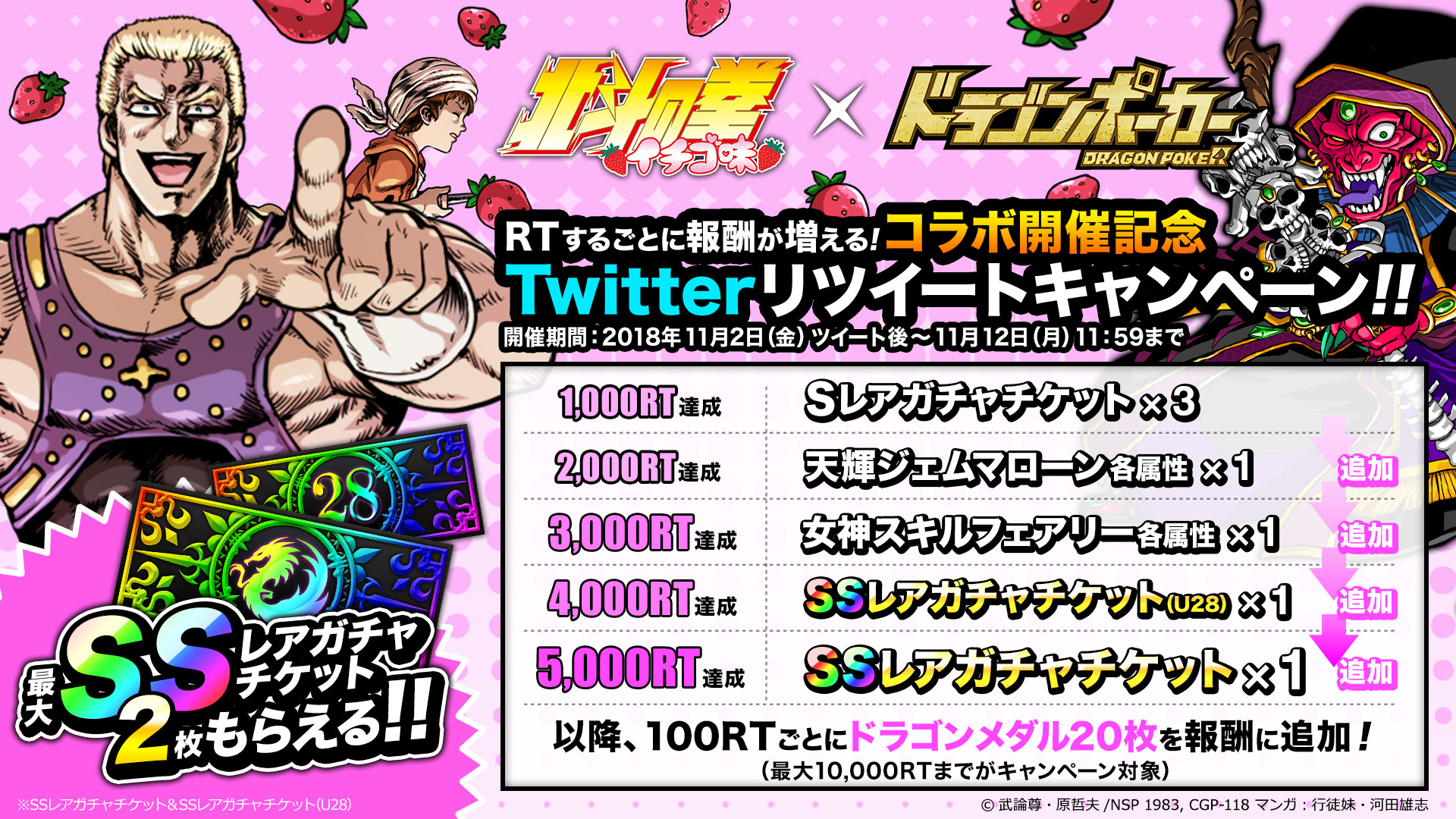 『北斗の拳 イチゴ味』とのコラボイベント開催決定を記念して、「Twitterリツイートキャンペーン」を開催いたします。『ドラゴンポーカー』公式Twitterアカウント(@DragonPoker_aso)がつぶやいた、キャンペーン対象ツイートの公式リツイート数が一定数を達成すると、ゲーム内で使用できるアイテムをユーザー全員にプレゼントいたします。