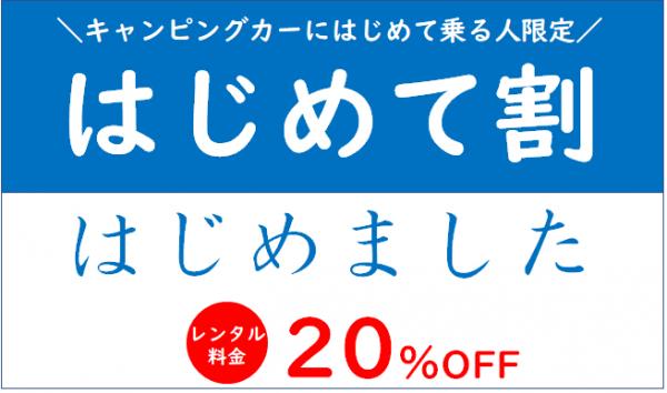 東京キャンピングカーレンタルセンターを運営するキャンピングカー株式会社(本社:東京都渋谷区、代表取締役社長:頼定 誠)は2018年11/5(月)~2018年12/21(金)までのレンタル利用を対象に、「はじめてキャンピングカーに乗る方」限定でレンタル料金が20%割引になるキャンペーン『はじめて割』を実施致します。
