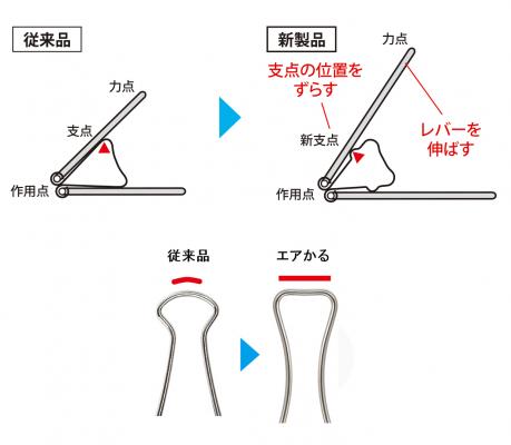 本体部分に突起をつくり支点の位置をずらし、さらにレバーの長さを伸ばすことで、「てこの原理」を応用し軽い力でクリップを開くことができます。