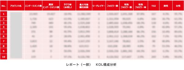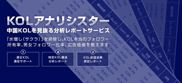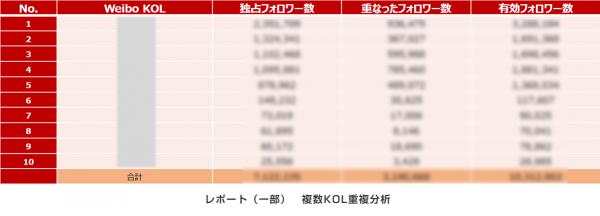 中国本土大手マーケティングリサーチ社のデータにより、「中国KOL分析レポート」マーケティングサービスを提供することができました。本土パトナー社では、数十種類のロジックパータンでKOLを分析し、AI学習機能で「水増し」アカウントを除去したレポーティングが可能になります。また、独自の「抽出」方法により、PRしたいサービスや商品に「相性」がよいKOLの分析も可能になります。