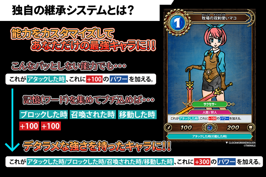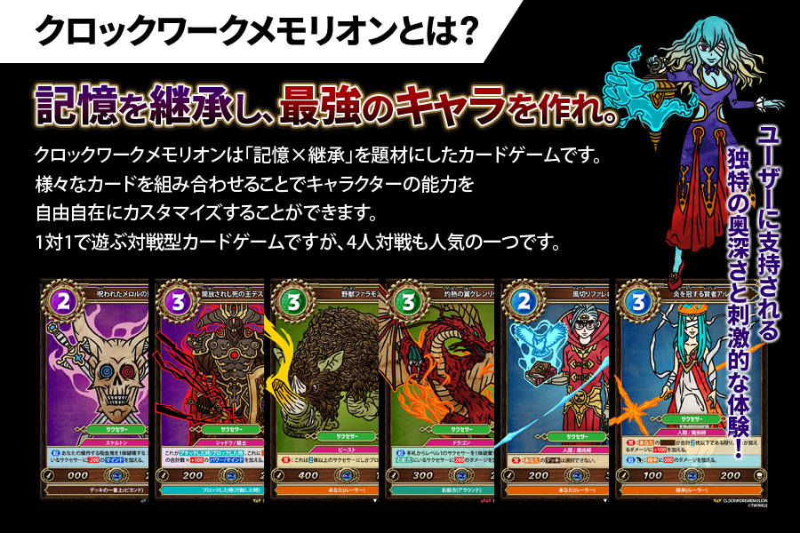 クロックワークメモリオンは「記憶×継承」を題材にした1対1、2対2対の対戦型カードゲームです。