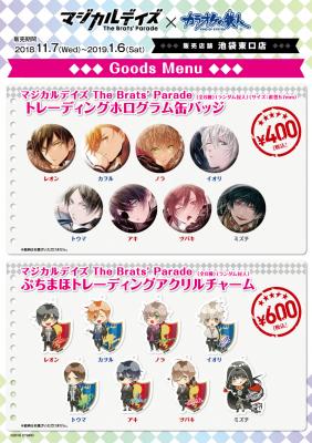 池袋東口店では「マジカルデイズ」のオリジナルデザイングッズを販売します。販売商品は、トレーディングカードイラスト缶バッジ全35種、トレーディングホログラム缶バッジ全8種がそれぞれ371円(税抜)[400円(税込)]、ぷちまほトレーディングアクリルチャーム全8種が556円(税抜)[600円(税込)]です。