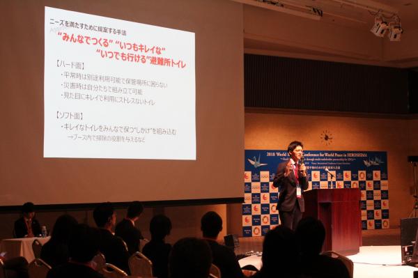 本ビジネスコンテストには、10月に行われた書類審査、及び東京・大阪・金沢会場にて開催された予選(プレゼンテーション)を通過した7社が広島で行われた本選大会に出場しました。当日は『2018国際平和のための世界経済人会議』のスタートアッププログラムとしてコンテスト本選が開かれ、本選に出場した7社はそれぞれ、5分のプレゼンテーションを行いました。当社からは常務執行役員 塚本直之が登壇しました。