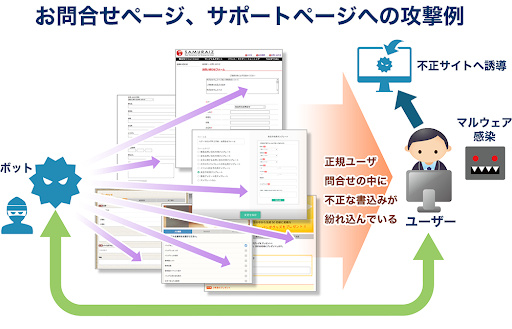 ロボットのもつ自動書き込み能力を使って、Webサイトでもっとも無防備であるID/パスワードを必要としないお問合せフォームに対して、人間であるかのような書き込みを行うことで、サイトオーナーに被害をもたらすことを目的とした攻撃です。