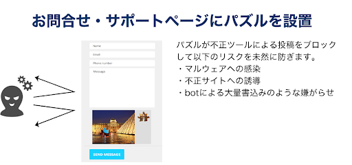 このたび販売を開始した「Capyパズルキャプチャお問い合わせフォームエディション」は、こういった新たな攻撃に対処するため、お問い合せフォームにパズルキャプチャを実装することでロボットによる書き込みを防ぎます。これにより、お問い合せフォームに書き込みを行おうとしたロボットは、テキスト入力を終えた後、最終の確定ボタンを押す前に、パズルの解読とピースの当て込みというロボットには非常に難解な行動を要求されるため、最終書き込みを行うことができなくなります。