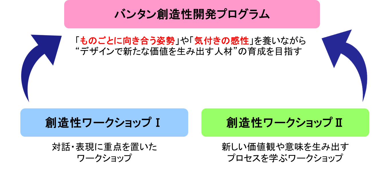 バンタンでは、クリエイティブの教育には知識の習得だけではなく「考えるチカラ」を伸ばすことが重要であるとの考えのもと、創造性を養うために独自で開発した「バンタン創造性開発プログラム」をカリキュラムに導入しています。「創造性ワークショップI・II」を通じて、受講生の「ものごとに向き合う姿勢」や「気付きの感性」を養いながら、“デザインで新たな価値を生み出す人材”の育成を目指しています。