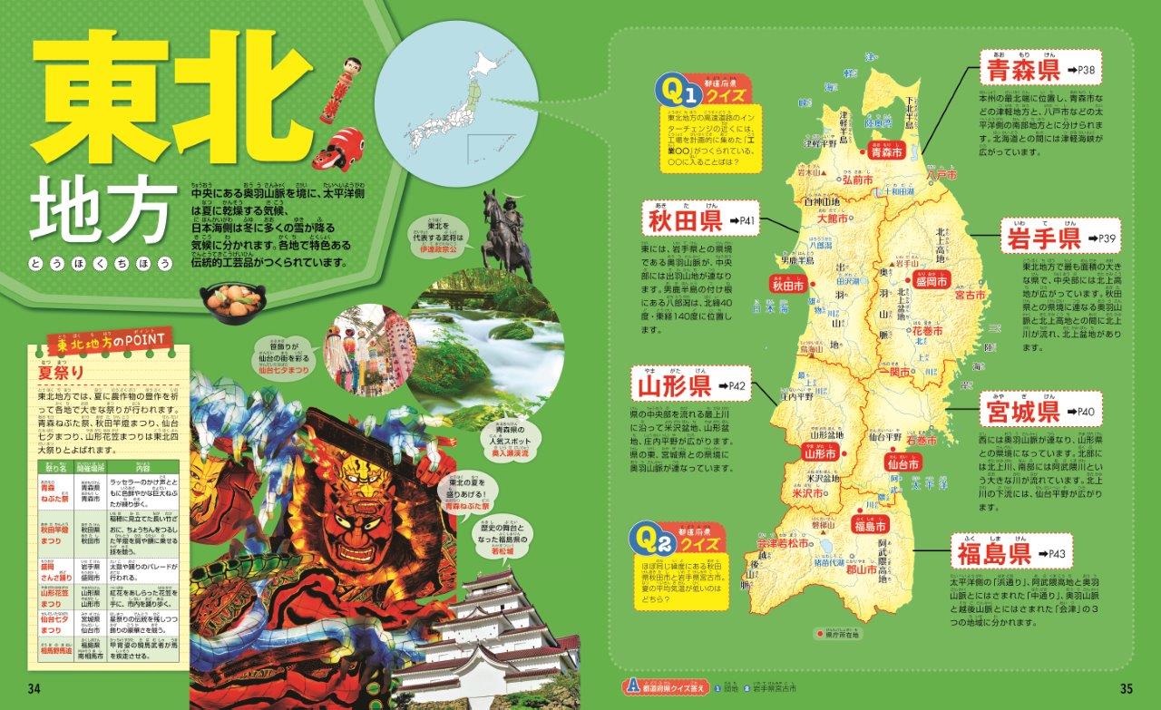 8つの地方や47都道府県のみどころ・主なスポットを写真付きで紹介。どんなところかのイメージを自然とつかむことができ、子どもの「行ってみたい」という好奇心をかきたてます。