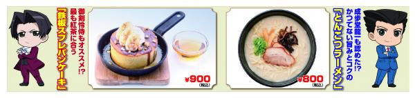 また、主人公の弁護士「成歩道龍一」の好物をイメージした「とんこつラーメン」741円(税抜)[800円(税込)]、ライバル検事・御剣怜侍の好物が紅茶であることにちなんだ「鉄板スフレパンケーキ」834円(税抜)[900円(税込)]の2種類のコラボフードを販売します。コラボフードは、カラオケルーム利用時限定で注文いただくことができます。